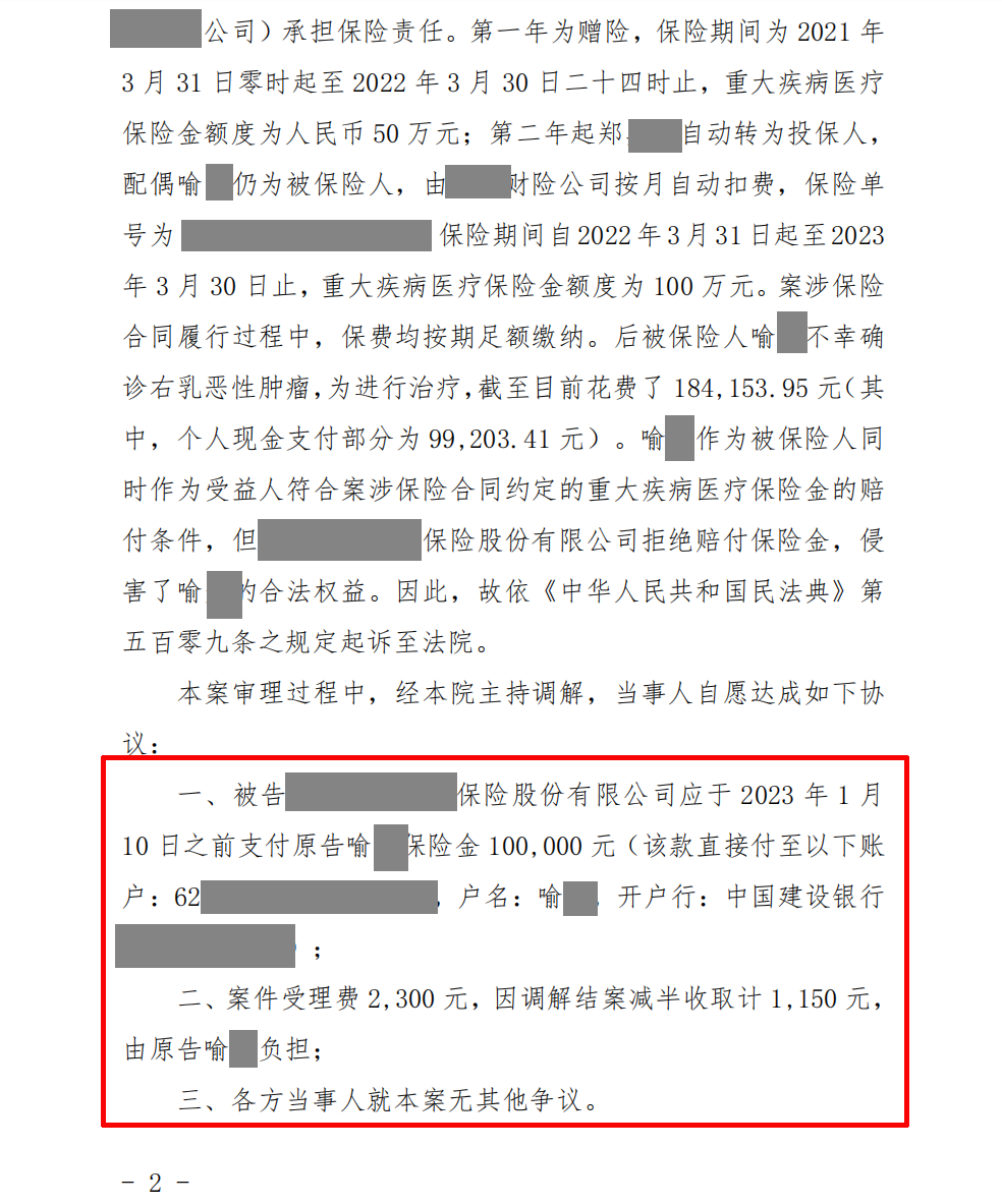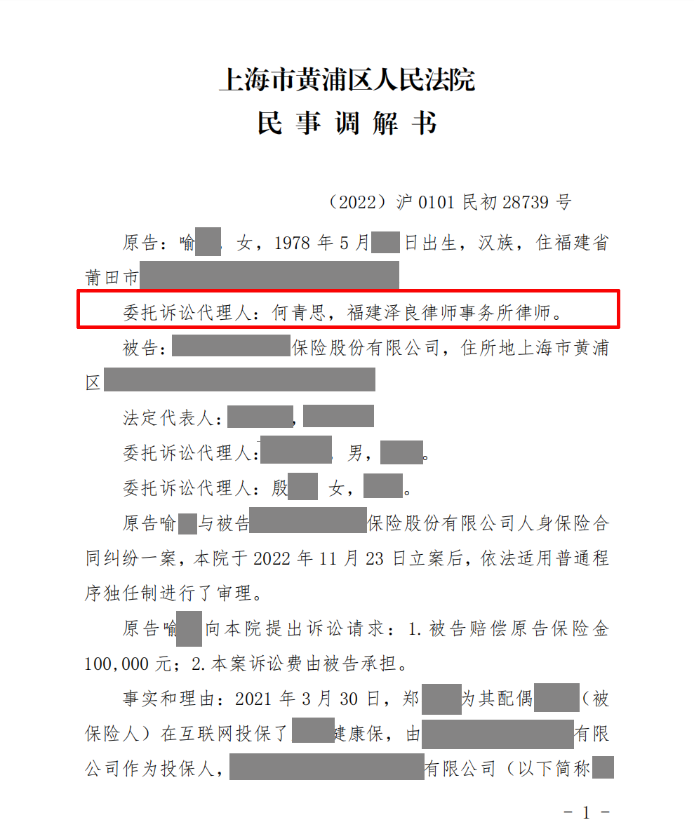 01 案例背景 Case background 2021年3月,Y在互联网投保了水滴健康保重大疾病医疗保险,第一年为赠险,第二年起,由保险公司按月自动扣费续保。 2021年8月,Y检查发现右乳肿物,2021年11月,复诊彩超,考虑双乳良性结节,右腋窝淋巴结可见,未进一步检查。2022年3月,Y被确诊为浸润性乳腺癌,为进行治疗,花费医疗费184153.95元。 02 遭遇保险拒赔 insurance claim was rejected 2022年4月,Y向保险公司申请理赔,2022年5月,保险公司却认为Y本次就诊不满足第一年度保单的赔付条件,不予赔付保险金,同时,保险公司还认为,Y本次就诊的疾病为第二年度保单投保前已患疾病,投保人未如实告知,不属于第二份保单的保险责任范围,也不予赔付第二年度保单的保险金。 03 委托泽良全力争取 Entrust the lawyer to fight 无奈之下,Y找到泽良律所,泽良保险法团队何青思律师接受委托后,全面分析投保过程、履行过程、条款约定等,在两周内快速立案。且在立案后积极庭前谈判调解,针对保险公司的拒赔理由,做了如下充分的准备: 1 丨从连续投保并不免除保险公司主动询问的义务入手,详细阐述了保险公司采取自动续保扣费的模式,属于自动放弃向投保人进行询问以及展示和确认条款的行为。即在保险公司未询问的前提下,投保人亦无告知义务,故保险以投保前已患疾未如实告知不属于保险责任的拒赔理由不能成立。 2 丨检索了大量的司法观点、专家观点以及全国范围内多个法院的有利案例予以支撑论证上述代理意见。 3 丨从保险公司是否对保险合同中的免责情形履行提示及明确说明义务切入,分析免责条款是否产生法律效力。 04 45天极速调解 45 days of extreme mediation 经过泽良律师有力的论证与强悍的庭审风格,保险公司在法院尚未判决前便同意协商调解,最终保险公司从拒赔0元到主动按照我方的诉求金额10万元调解结案,值得一提的是整个过程泽良律师只用了45天,成功翻盘获赔。 — 本案调解书 — - 滑动查看案例详情 - 本案亲办律师